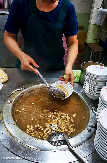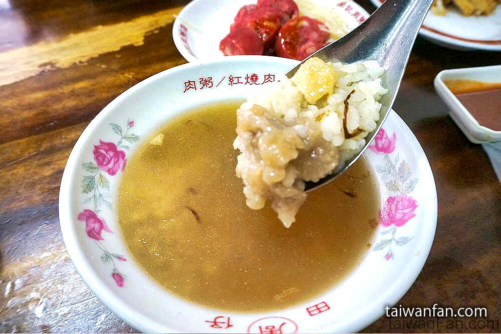 The meat congee is famous, and is served in a meat broth with a dash of pepper.
